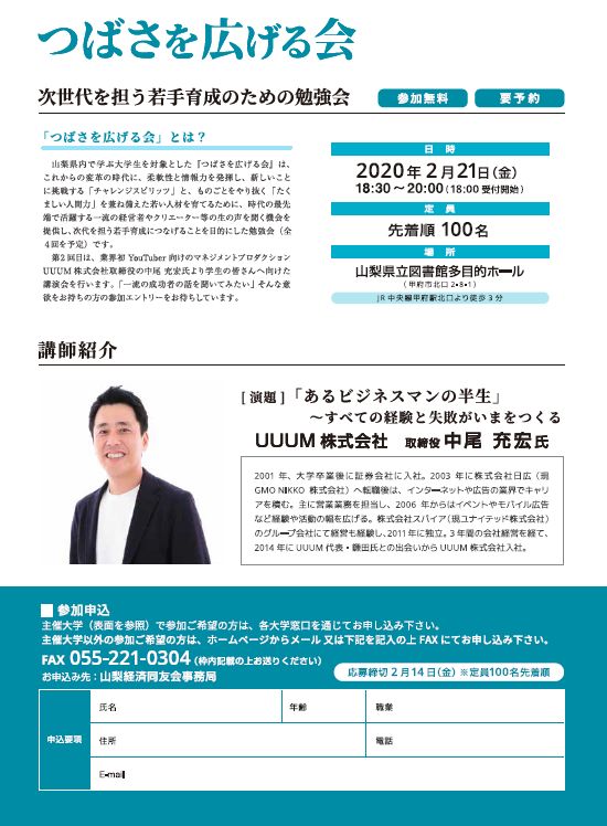 山梨県内で学ぶ大学生を対象にした「つばさを広げる会」は、時代の最先端で活躍する一流の経営者、クリエーター等の生の声を聞く機会(全4回を予定)を提供します。